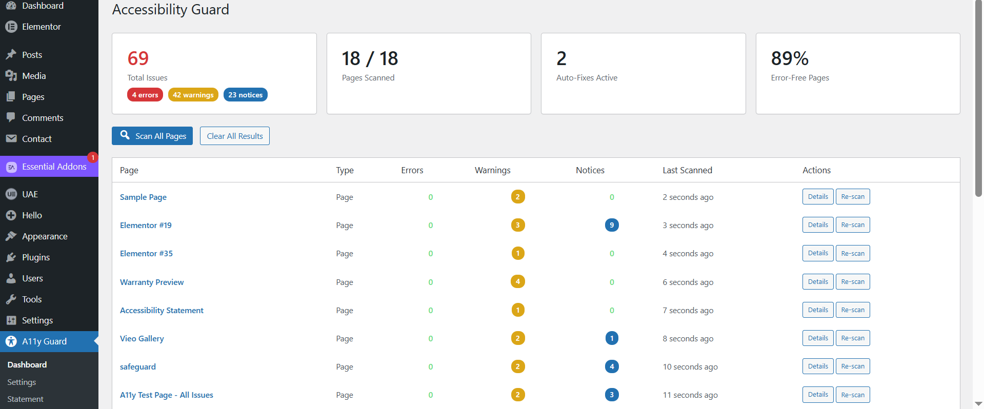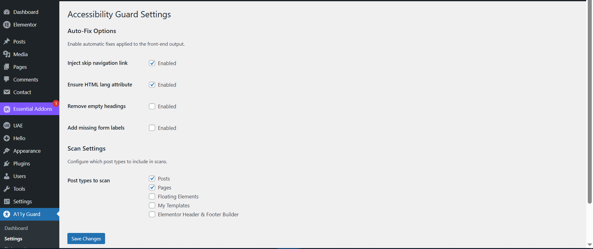 Accessibility Guard scans the rendered HTML output, so it works with Elementor, Divi, Beaver Builder, WPBakery, Gutenberg, and any other page builder or theme.