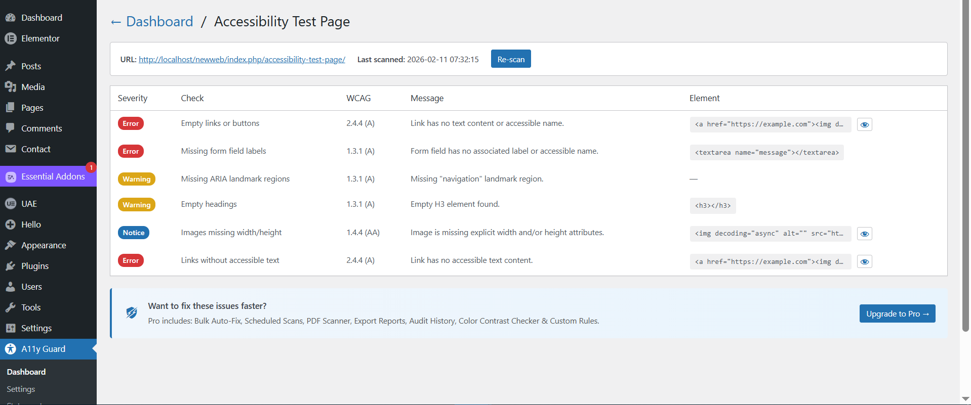 Accessibility Guard is a free WordPress plugin that scans your pages for WCAG 2.2 accessibility issues and helps you fix them. Unlike overlay widgets that mask problems without fixing them, this plugin identifies issues at the source code level.