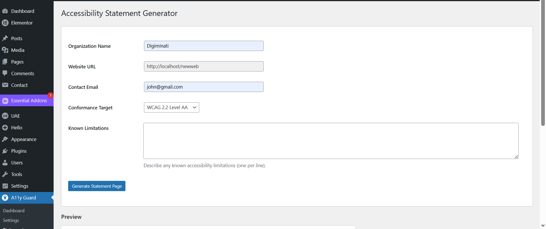 Generate a complete accessibility statement page with your organization details, WCAG conformance target, and known limitations.