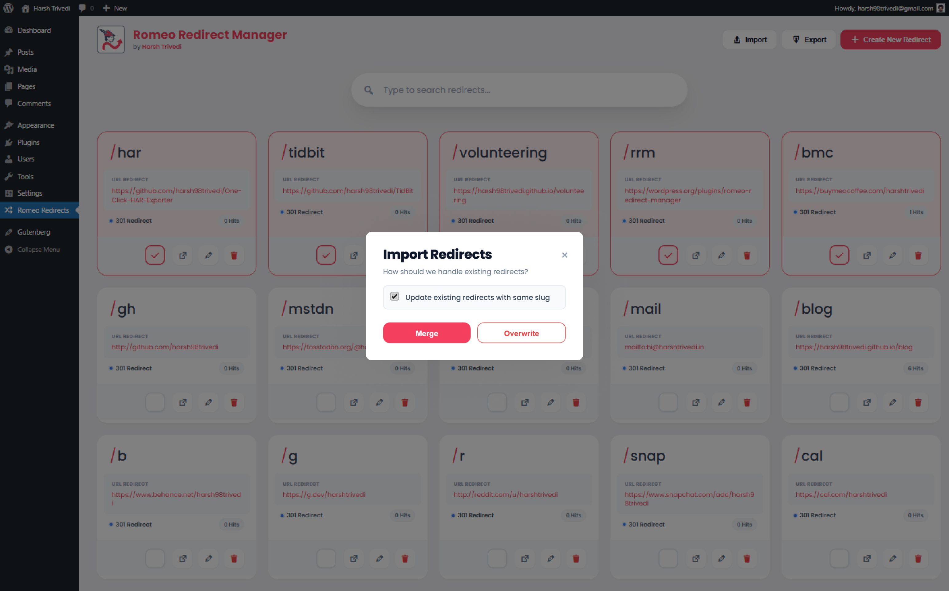 /wp-content/plugins/romeo-redirect-manager/or install via the Plugin Installer. - Activate through the “Plugins” menu.